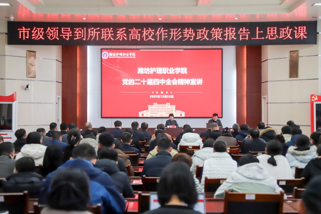 12月23日,潍坊市委常委、临朐县委书记刘艳芳到我院为师生代表讲授思政课,宣讲党的二十届四中全会精神,并调研有关工作。学院党委书记崔照忠主持报告会,学院领导班子成员、副科级及以上干部、师生代表聆听报告。