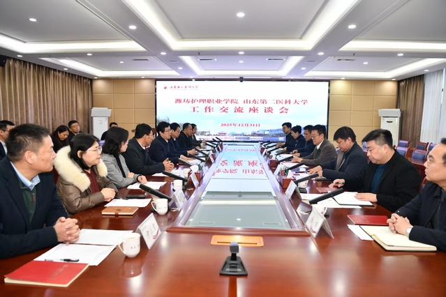 为深入推动“双校双院”协作提升行动走深走实,凝聚卫生健康人才培养合力,12月31日,潍坊护理职业学院党委书记崔照忠、院长王文军率队赴山东第二医科大学开展专题工作对接,共商协同发展大计。山东第二医科大学党委书记张建华、副校长王承高热情接待并出席座谈会。